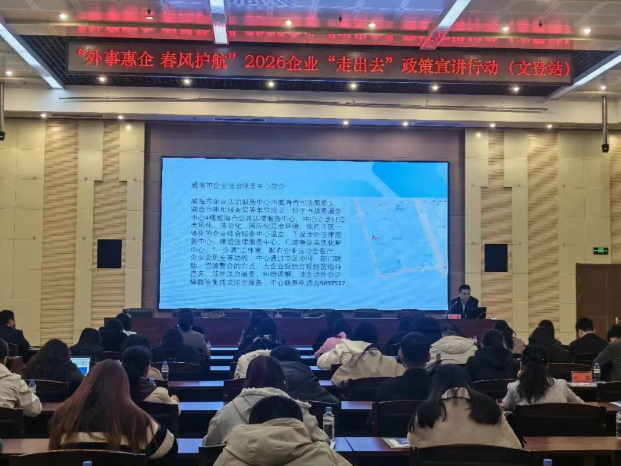 近日,威海市外办联合市司法局、贸促会、文登区外事服务中心等部门举办“外事惠企 春风护航”2026企业“走出去”政策宣讲行动。文登区镇街、园区负责人及区内外向型企业代表80余人参加行动。